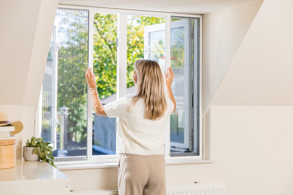 Het gevouwen gaas sluit de opening keurig af en blijft netjes op zijn plaats. Er is geen veer nodig, zodat de raamplissé bijna geruisloos en met weinig kracht bediend kan worden. Omdat het gaas zwart is en daardoor niet reflecteert, wordt het uitzicht slechts minimaal gehinderd.